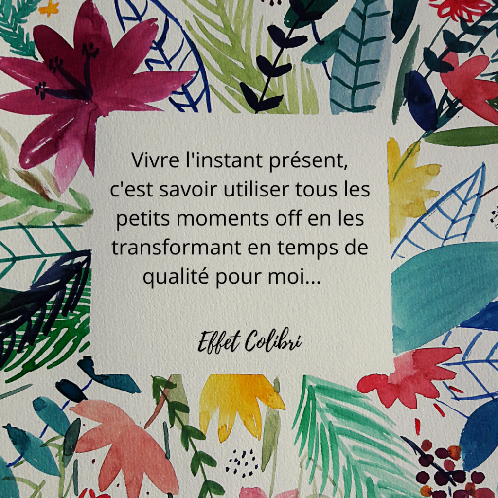 Vivre le moment présent, c’est choisir de faire des activités en toute conscience… en étant pleinement à ce que l’on fait et en essayant de se concentrer sur son corps, sur ses sensations afin de calmer le flot de nos pensées…