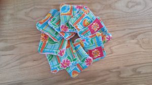 Des lingettes démaquillantes et des lingettes lavables pour bébé. Pleins de créatrices en proposent… Vous pouvez aussi en confectionner vous-même. J’ai fait les miennes à la main avant d’avoir une machine à coudre et ça se fait bien… On coud nos deux carrés, endroit contre endroit en laissant un espace pour retourner le tissu. Puis on finit la couture sur l’endroit…