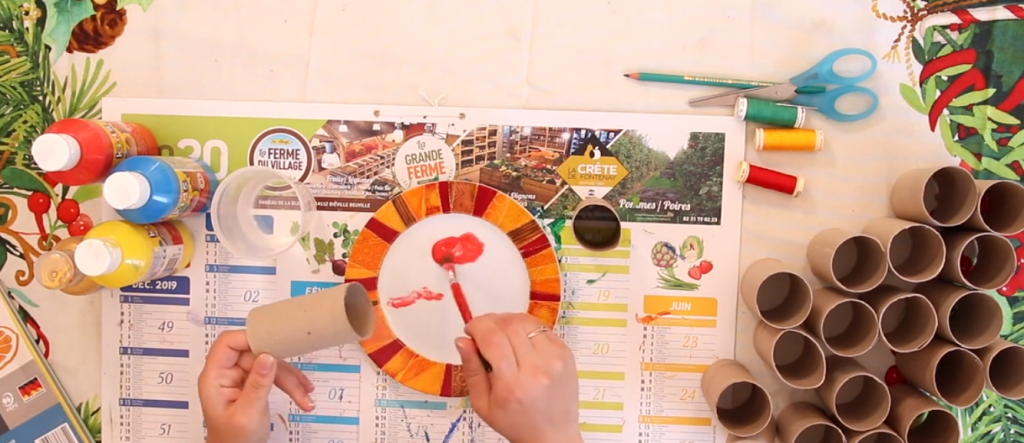 Etape 1 : peindre les 24 rouleaux de PQ aux couleurs de ton choix ! Gardes-en 3 pour faire le tronc (en marron) !