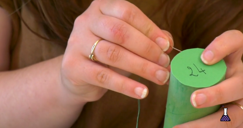 Etape 4 : Attacher chaque rond à son rouleau avec du fil et une aiguille ! (Etape la plus longue et fastidieuse : embaucher votre entourage !)