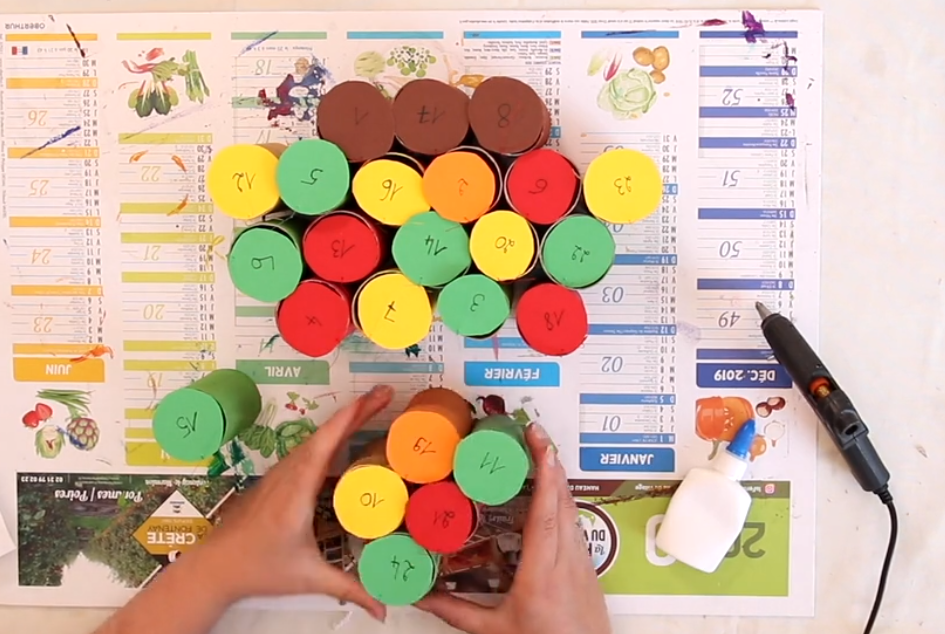 Etape 3 : Préparer la disposition des rouleaux en forme de sapin et disposer les chiffres sur les rouleaux !