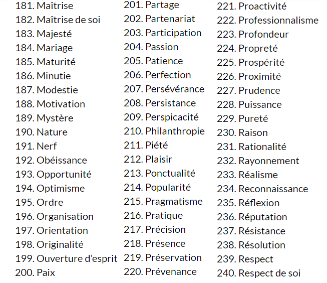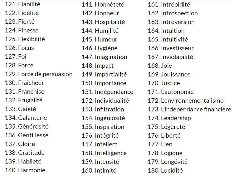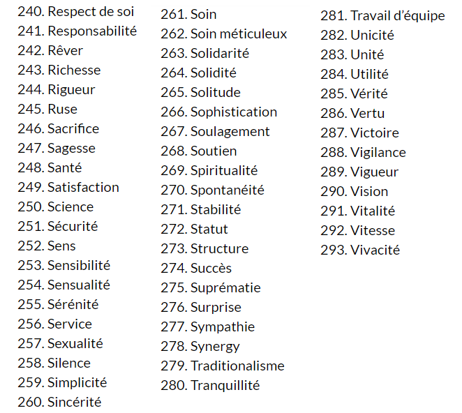 Je te propose de faire un premier exercice autour des valeurs : liste les 20 qui te correspondent le plus parmi cette liste très exhaustive !! Je l’ai tiré du site de David Laroche.