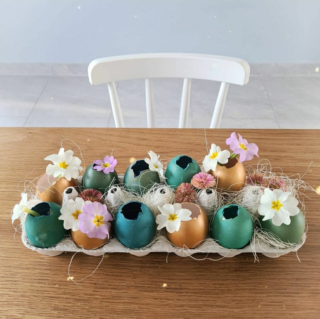 - Utiliser les coquilles comme mini vase pour des fleurs de jardin : pâquerettes, lamier pourpre, primevères, pissenlits ou en ajoutant des fleurs séchées