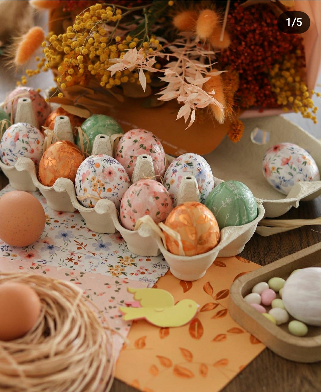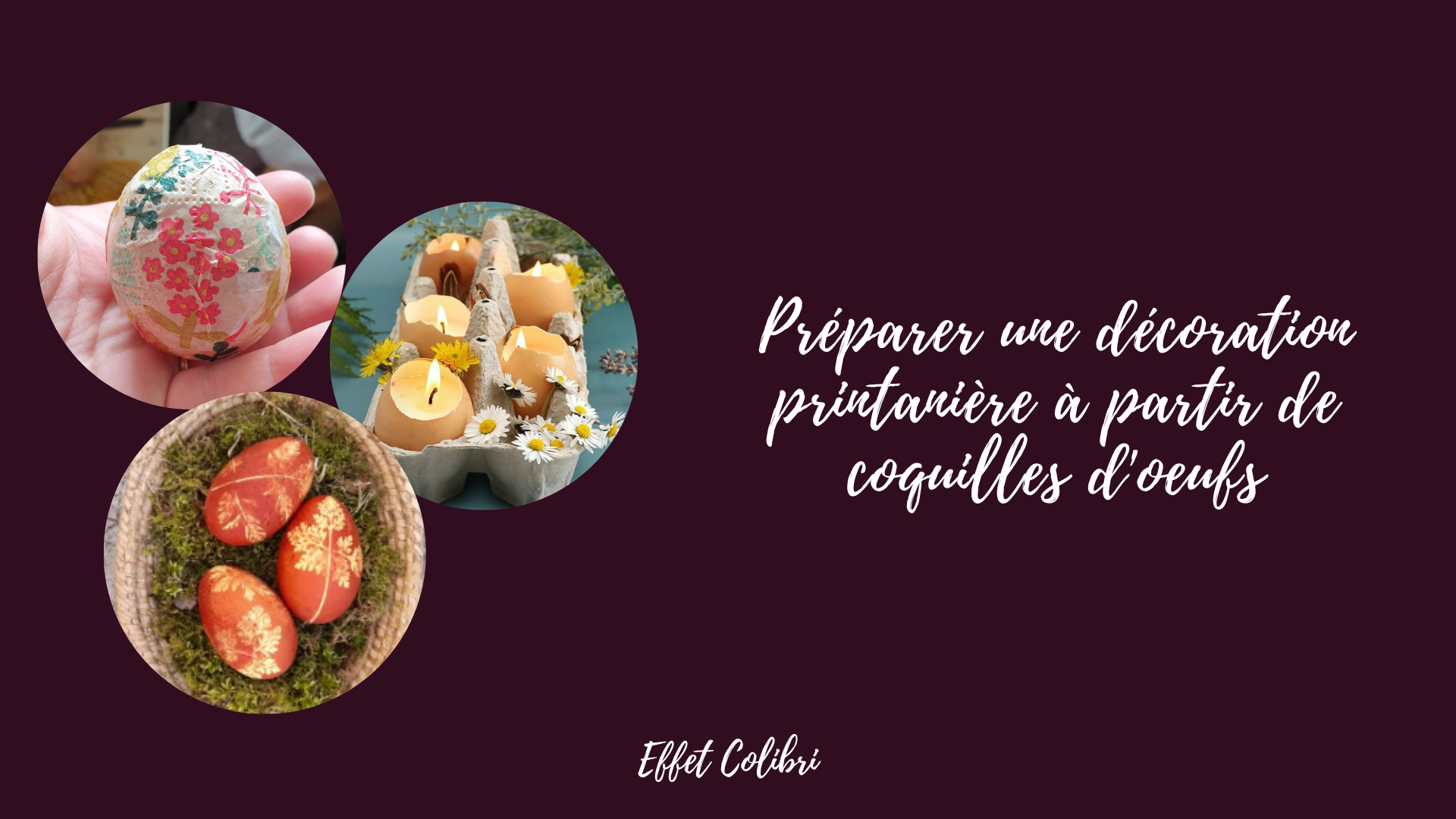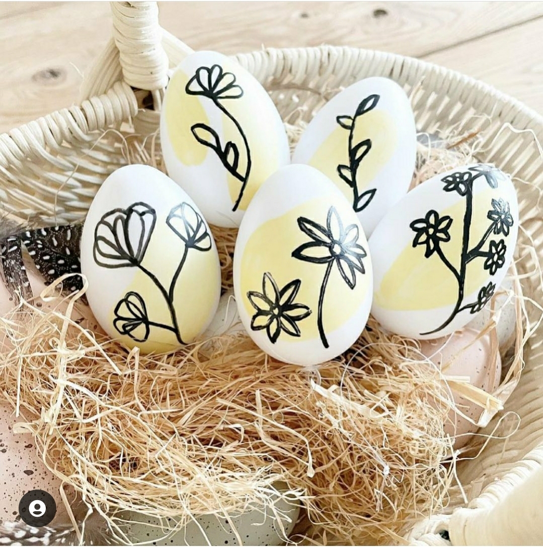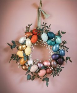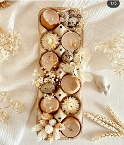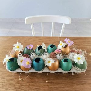 Tous ces oeufs décorés, tu peux les insérer au milieu dans une boite d’oeufs et la décorer avec des fleurs / feuillage en centre de table.
