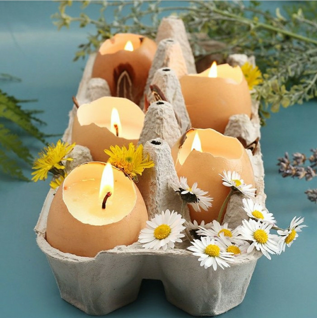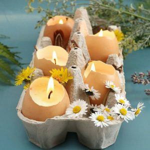 - Transformer les coquilles en bougies en faisant fondre de la cire et en la versant dans les coquilles. (Pour cela je recommande la cire de soja)
