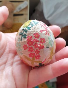 - Peindre avec du vernis colle la coquille de l’oeuf et apposer des morceaux de papier coloré.
